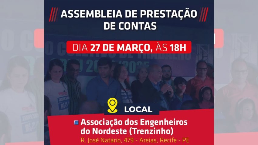 O Sindmetro-PE, no âmbito da gestão Unir e Lutar com a Categoria, convida toda a categoria para participar da prestação de contas na próxima quarta-feira, 27 de março, às 18h. Isso demonstra nosso compromisso com transparência e comunicação, reafirmando o sindicato como um espaço aberto a todos e todas que contribuem para a luta coletiva.