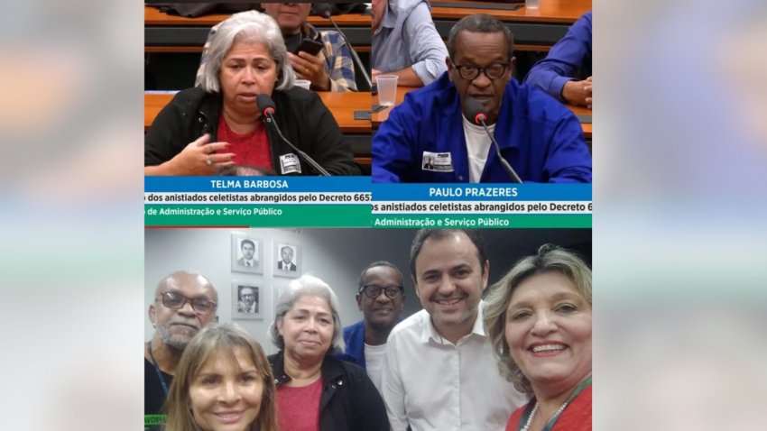 Os membros da comissão dos anistiados da CBTU, Paulo Prazeres, Emmanuel Paulo, Jane Machado e Telma Barbosa, estiveram presentes na audiência pública realizada no dia 17/06/2024, às 16:30h na Comissão de Administração e Serviços Públicos da Câmara dos Deputados em Brasília. Com o plenarinho completamente lotado de trabalhadores e trabalhadoras anistiados pela lei 8878/94, a deputada Érika Kokay PT/DF, autora do requerimento, debateu sobre a Situação dos anistiados celetistas abrangidos pelo Decreto 6657/08, sobre o assédio e descriminação sofrida pelos reintegrados desde o seu retorno aos postos de trabalho. A companheira anistiada e ex-empregada da CBTU, Nakeida Ramos também se fez presente.